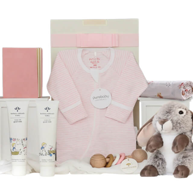 Spoil a newborn baby girl with this gorgeous hamper. Filled with the highest quality gifts for baby and a beautiful keepsake for Mum, it's the perfect way to say 'welcome to the world'. Pamper a new arrival with a 100% organically grown cotton muslin wrap, a Purebaby cotton growsuit, a natural beechwood rattle, gentle bathtime products, and a soft plush bunny. The new parents will also receive an elegant pink notebook to write down milestones and memories.