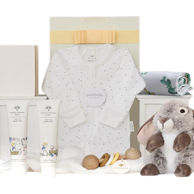 Spoil a newborn baby with this gorgeous hamper. Filled with the highest quality gifts for baby and a beautiful keepsake for Mum, it's the perfect way to say 'welcome to the world'. Pamper a new arrival with a 100% organically grown cotton muslin wrap, a Purebaby cotton growsuit, a natural beechwood rattle, gentle bathtime products, and a soft plush bunny. The new parents will also receive an elegant pink notebook to write down milestones and memories.