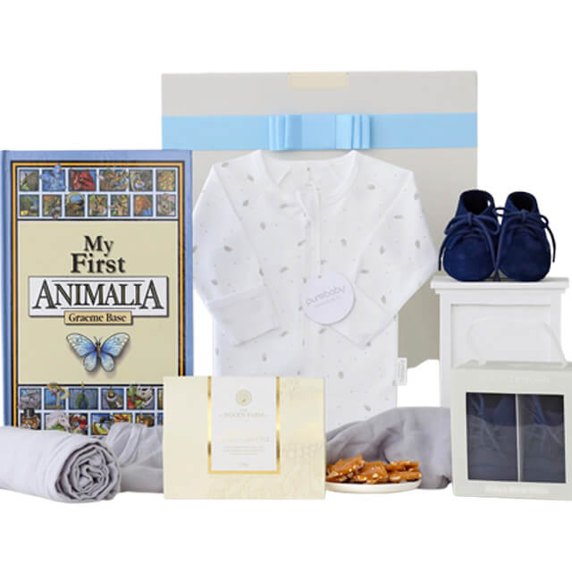 Oh, the adventures he'll go on over a lifetime. Thanks to this gorgeous baby hamper, he'll be ready from the start with his own blue suede shoes, beautiful organic babywear from Pure Baby, and the My First Animalia based on the iconic Australian children's book. It's the perfect gift for a sweet new arrival.