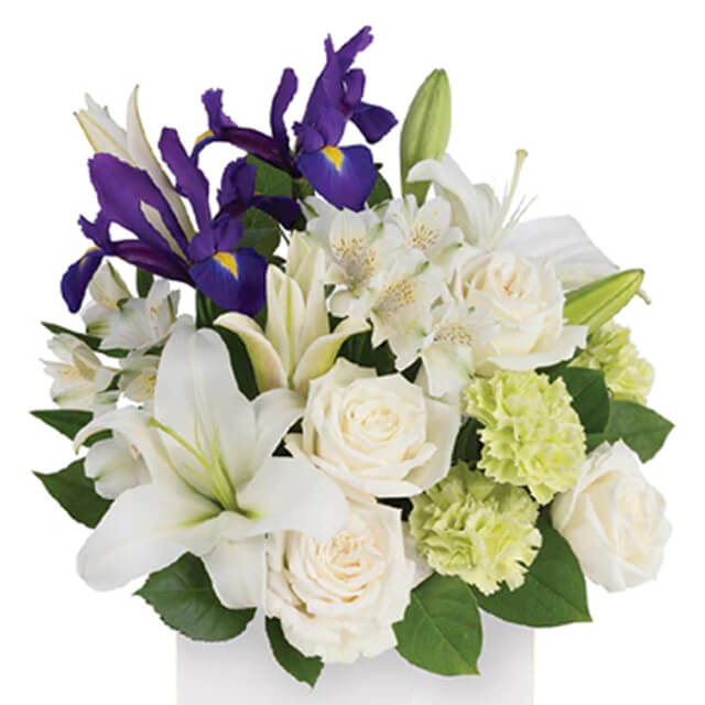 Gorgeous white lilies and delicate blue iris dance gracefully with white roses , white alstroemeria and soft lime carnations in this luxurious arrangement.