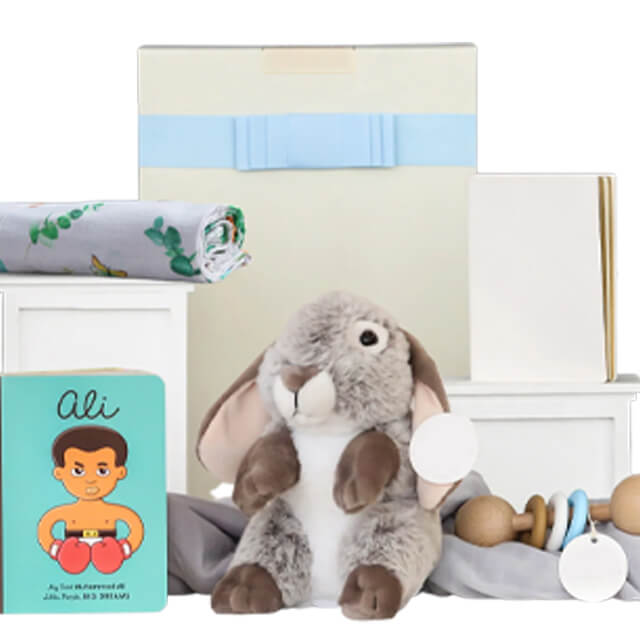 Give the gift of storytime in a luxury box with this baby hamper themed around Muhammad Ali. It features a gorgeous book about Ali's life and career told in words a baby can understand. It's also got Buttons the Bunny, a Beechwood Rattle, and gorgeous baby essentials. Get baby dreaming of all the things he can do in life while he's little.