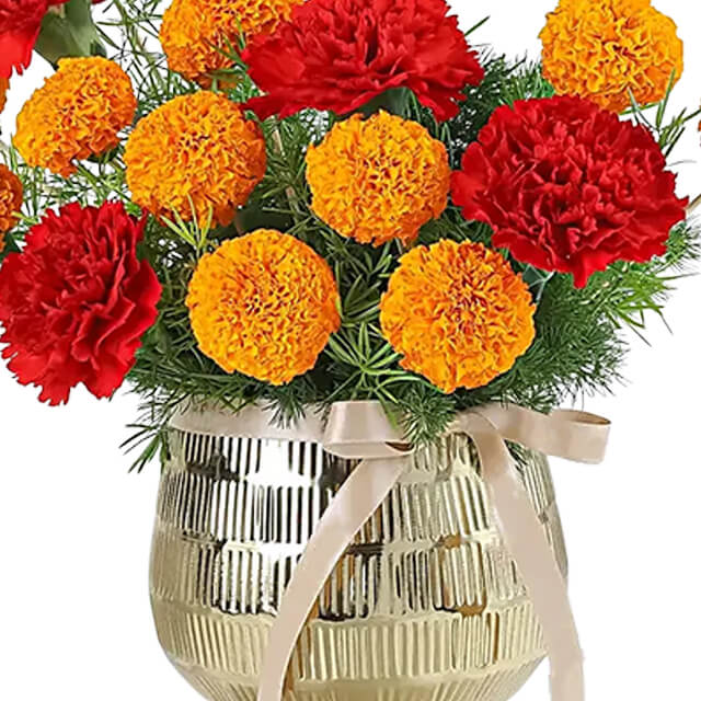 Vibrant and festive this arrangement brings together the bold charm of red carnations and the radiant brightness of orange marigolds. Accented with fresh green fillers the design feels both lively and elegant. Beautifully presented on a golden metal base and tied with satin ribbons it carries a celebratory glow thats perfect for special occasions. Whether for festivals housewarmings or heartfelt gestures this creation captures the essence of joy and tradition making it a thoughtful gift that brightens spaces and spreads warmth with timeless beauty.