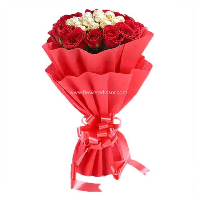 Bouquet of Ferrero Rocher Chocolate - 16 pcs. & Red Roses - 16, , Two Layer Paper Wrapping - Red, Ribbon Bow - Red, Seasonal Fillers