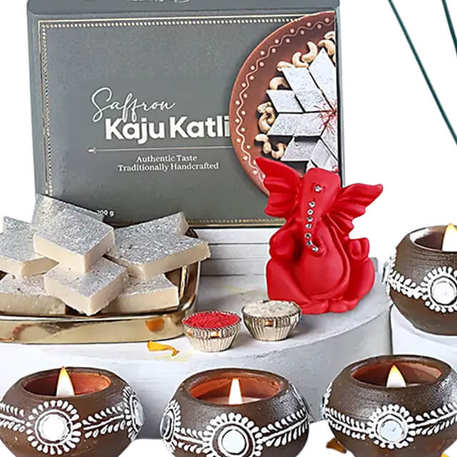 Immerse your loved one in divine festivities with delectable kaju katli, an exquisite embodiment of sweet indulgence. The bundle also features a set of terracotta diyas, handcrafted with precision to infuse their home with a warm, welcoming glow. A Ganesha idol stands as a symbol of prosperity and blessings, while the vibrant mauli thread signifies protection and well wishes. This combination of culinary excellence and sacred adornments makes for a perfect gift.