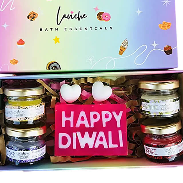 Share the spirit of diwali and create moments of warmth and happiness with this thoughtful gift. Inside, they'll discover a delightful array of mini candles, each infused with fragrant notes of rose, lavender, sandalwood and jasmine, evoking a sense of calm and joy. To add a touch of festivity, a 'happy diwali' soap is included, symbolising the triumph of light over darkness. This beautifully packaged gift box is not just a treat for the senses but also a token of love and blessings.