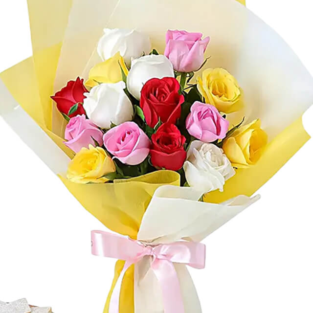 A vibrant celebration of colour and sweetness this gift combines the charm of roses in yellow white revival pink and red for a bouquet full of warmth and elegance. Wrapped in soft yellow and off white paper and finished with a pink satin ribbon it carries both freshness and style. To complete the gesture rich saffron kaju katli adds a traditional indulgent touch making this gift ideal for festive occasions heartfelt thanks or special celebrations. Its a perfect blend of floral beauty and sweet delight.