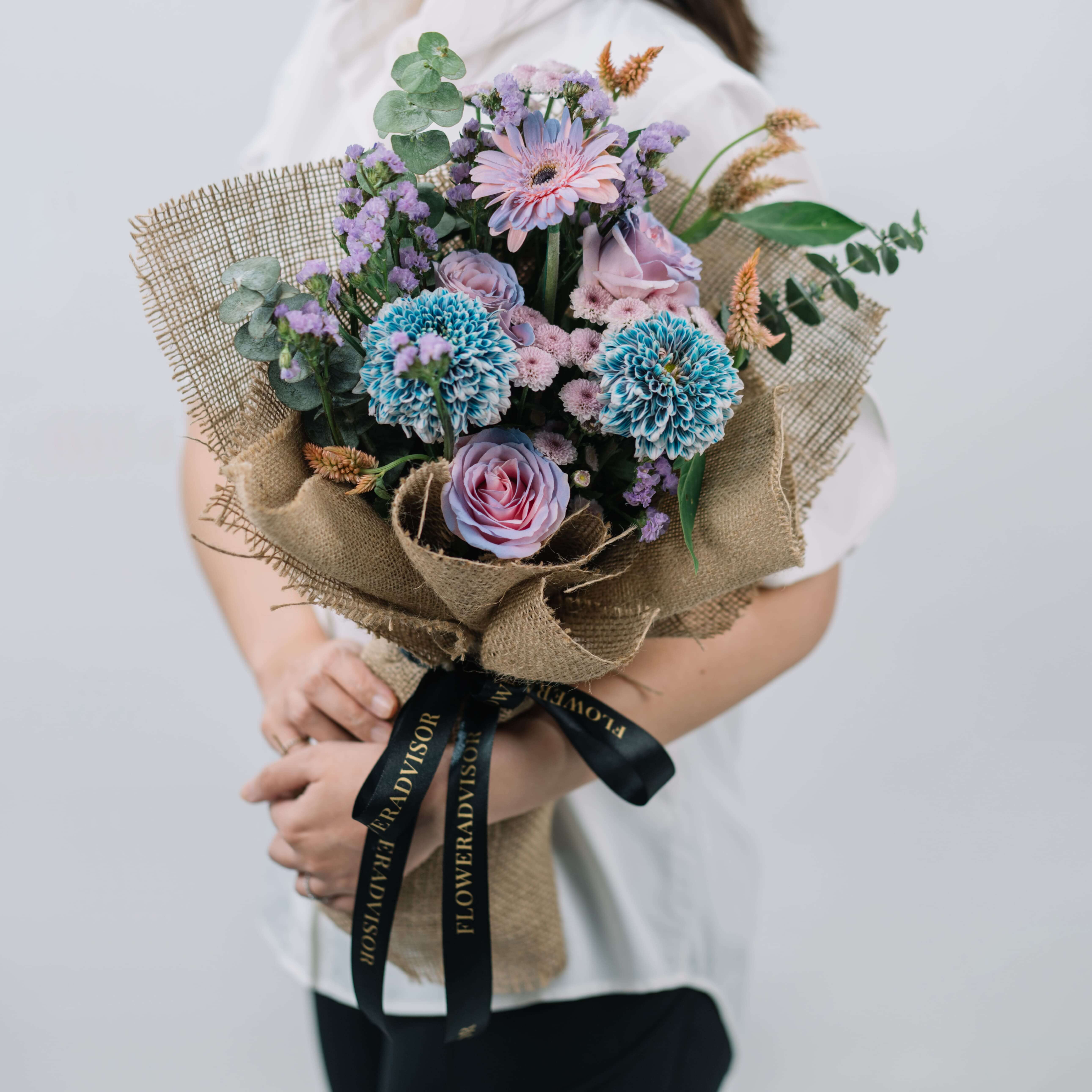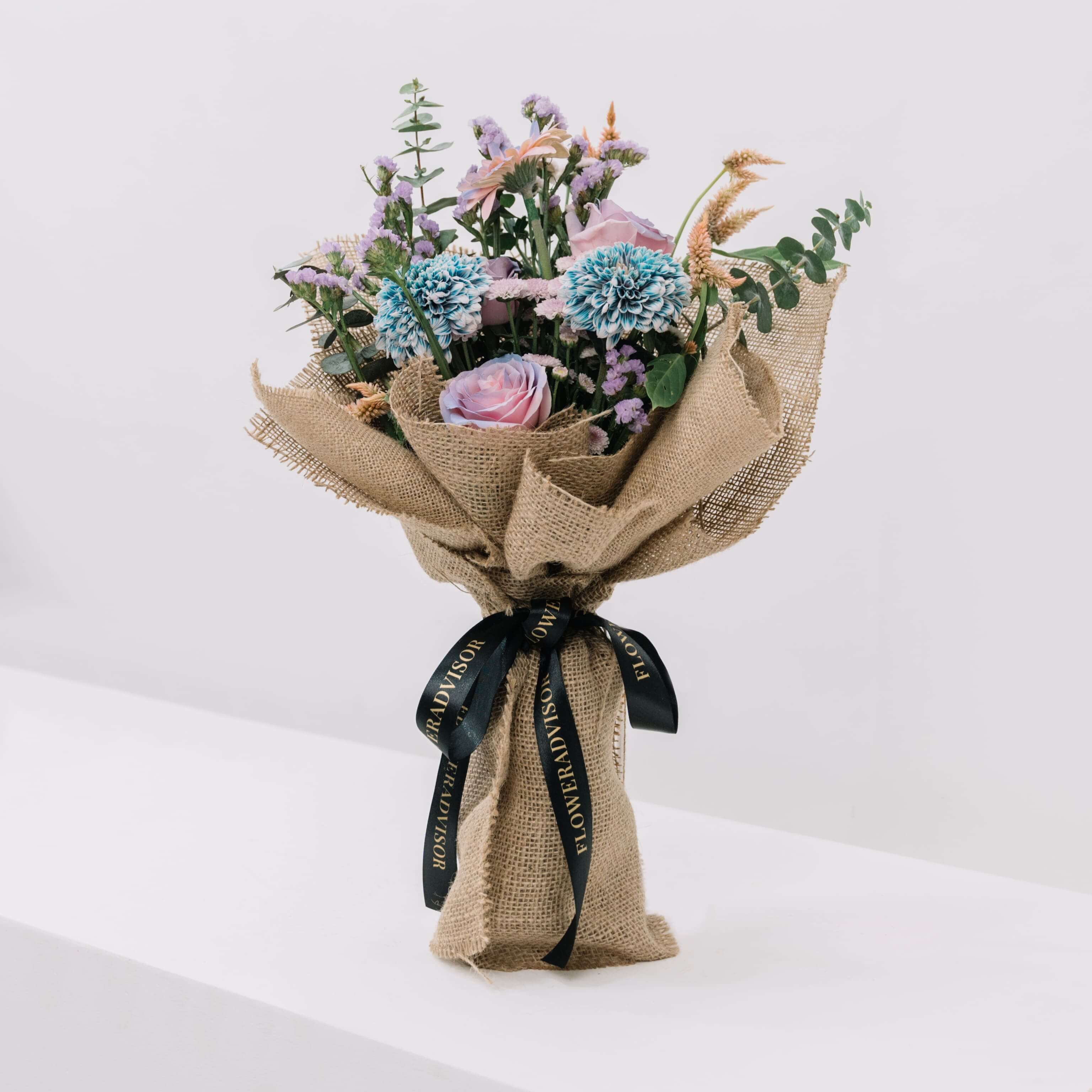 Rangkaian ini seolah berasal dari halaman dongeng tempat warna dan bunga bermain bebas. Perpaduan nuansa ungu, biru lembut, dan pink ke dalam harmoni lembut menciptakan taman kecil penuh imajinasi. Cocok untuk merayakan ulang tahun, menghibur hari yang muram, atau sekadar mengirimkan pelukan lembut lewat bunga.