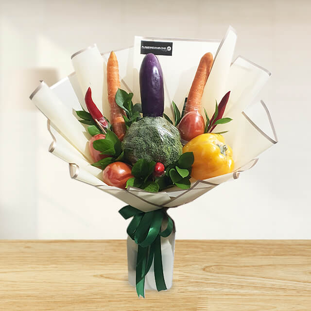 A vegetable hand bouquet consisting of 1 broccoli, 1 bell pepper, 3 tomatoes, 3 chilli, 2 carrots, and 1 eggplant.