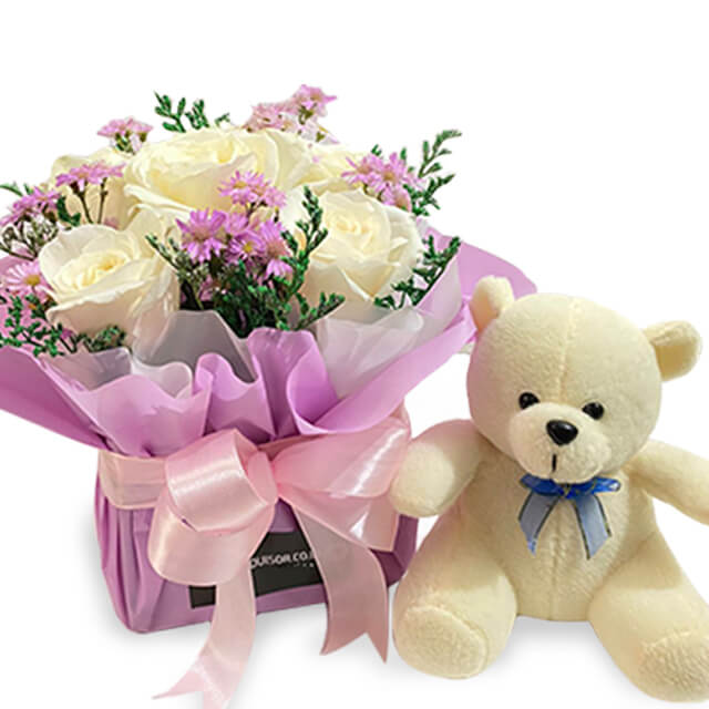A heartwarming floral arrangement featuring 6 white roses paired with a cute 6" teddy bear. The soft white roses bring a delicate, serene atmosphere, while the teddy bear adds a playful touch of charm. Perfect for birthdays, baby showers, or any special occasion for kids, this thoughtful gift is sure to be cherished for years to come.