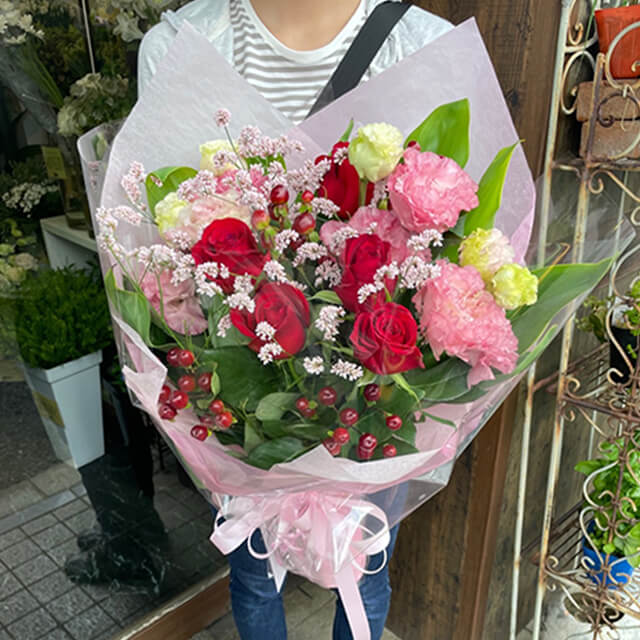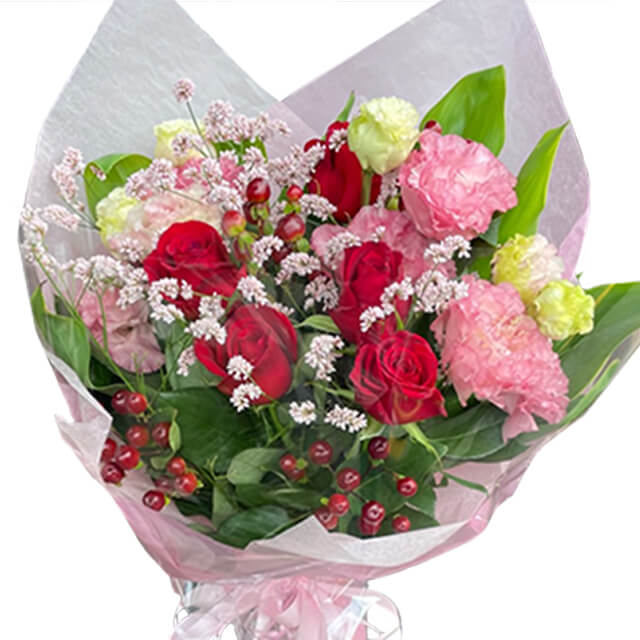 5 x Red Roses 2 x Pink Lisianthus Seasonal Flowers Green Fillers Wrap Ribbon Card