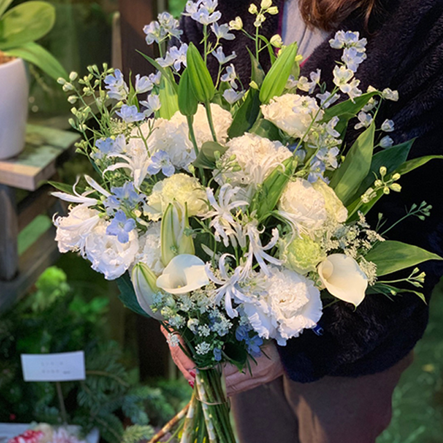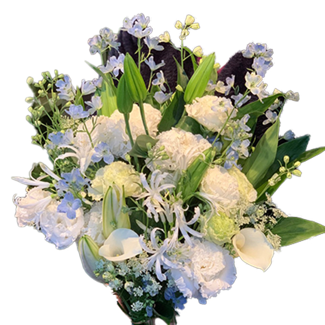 2 x White Oriental Lilies 4 x White Lisianthus Seasonal Flowers (White & Blue) Green FIllers Wrap Ribbon Card