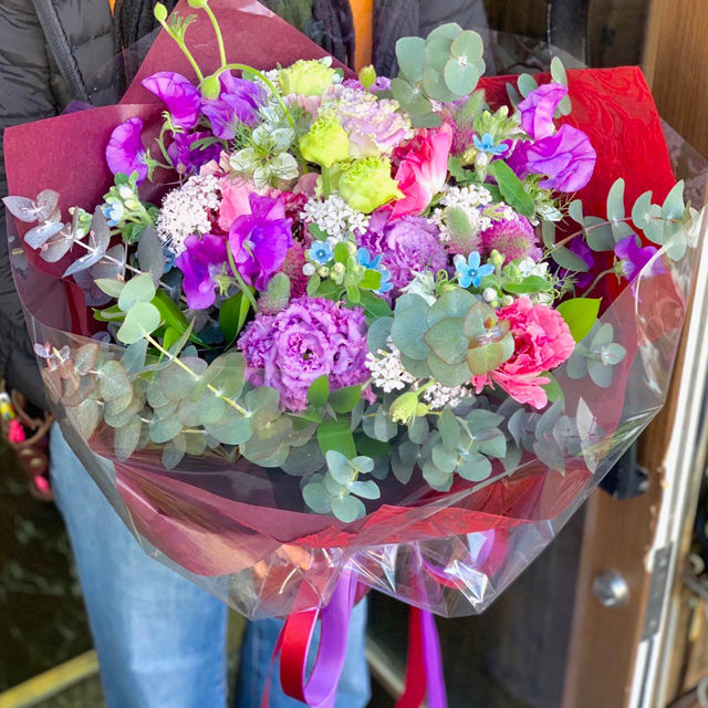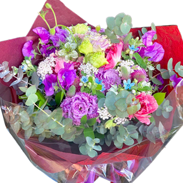 3 x Purple Lisianthus Seasonal Flowers (White, Purple, and Pink) Green Filler Wrap Ribbon Card