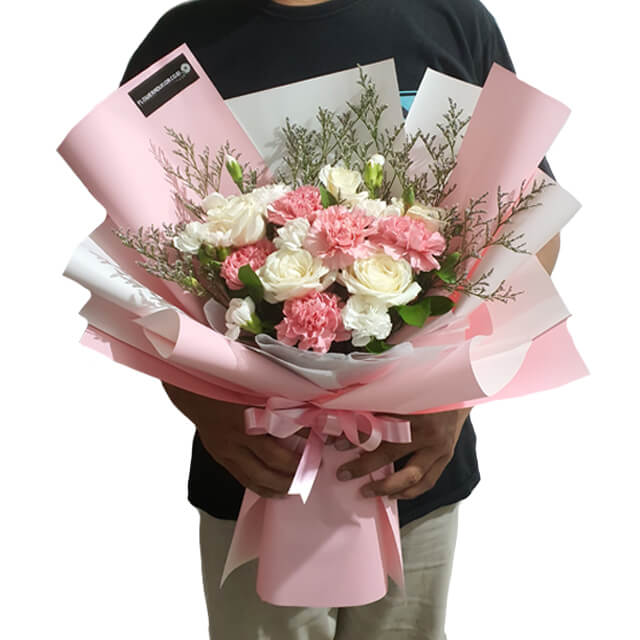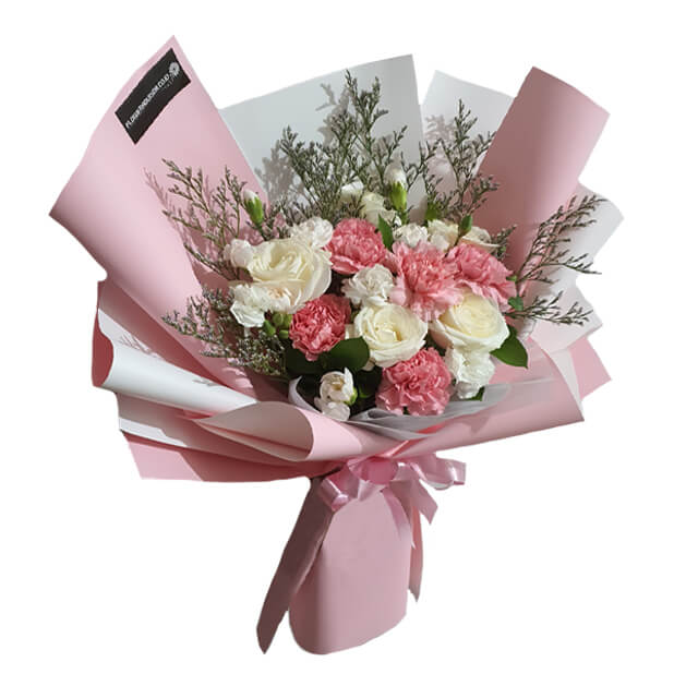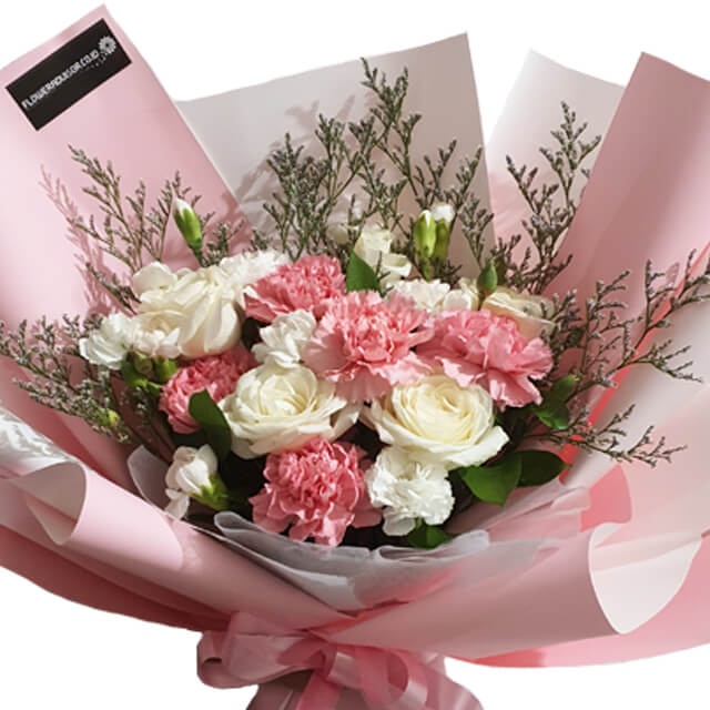 A radiant hand bouquet featuring a blend of 5 vibrant carnations, 5 elegant white roses, additional white carnations, and caspea fillers. This uplifting arrangement symbolizes hope and renewal, making it an ideal gift to brighten someone’s day or celebrate new beginnings. Perfect for expressing encouragement and warmth to your loved one.