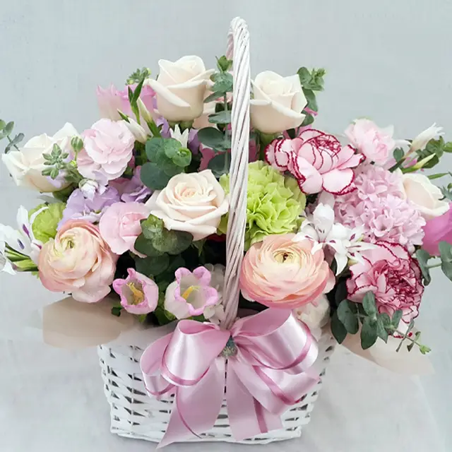 Romantic flower basket with white roses, pink roses, purple flowers, pink fillers, and greenies