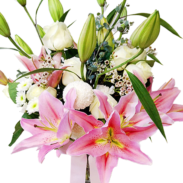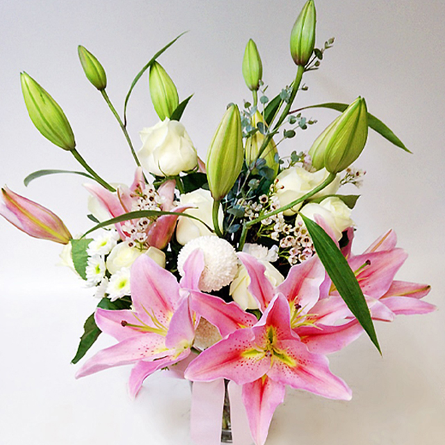 A simple arrangement of lilies that comes in bud form and blooms, together with white roses and poms