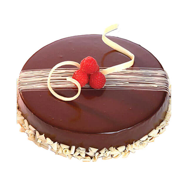 Chocolate Cake with Black Cherry topping, decorated with Swiss Chocolate and Seasonal Fruits. Size: 8 Inches