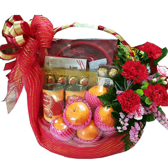 A delightful Chinese New Year basket featuring 8 fresh Mandarin oranges, 2 cans of premium abalone, golden coin chocolates, and an assortment of delicious cookies.
