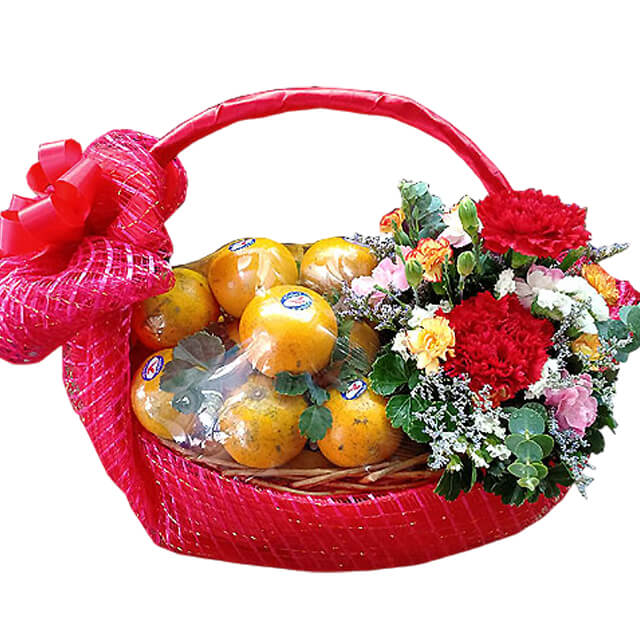 A beautifully arranged basket featuring 18 fresh oranges, representing abundance and prosperity for the season.