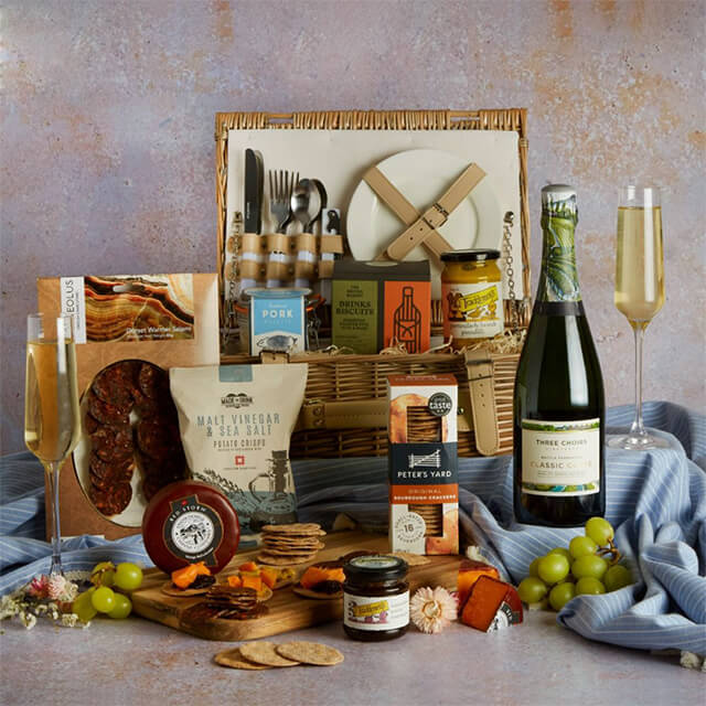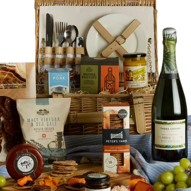 This Hamper Includes: - Wicker Basket - Three Choirs Classic Cuvee English Sparkling Wine 75cl - Peters Yard Original Sourdough 105g - The Drinkers Bakery Drinkers Gift Set Biscuits - 40g Made For Drink Malt Vinegar & Sea Salt Potato Crisps - Tracklements Caramelised Onion Marmalade, 110g - Tracklements Piccalilli 270g - 200g Snowdonia Red Storm - 80g Capreolus Dorset Warmer Salami - Cornish Charcuterie Traditional Pork Rillette (125g)
