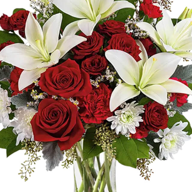 Scarlet roses and pristine lilies ignite like stars against silvery eucalyptus and dusty miller’s delicate glow, all cradled in a tall cylinder vase that transforms any space into a haven of romance. This isn’t just a bouquet—it’s the reason grand gestures exist.