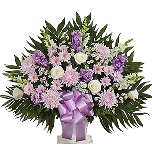 The purple and white flower sympathy floor basket is a wonderful gift to express your care. It is carefully crafted with white and lavender blooms including roses, snapdragons, mums and stock. Floor baskets are typically sent to a family member, friend or co-worker. Arrangement measures approximately 32""H x 36""L. Includes: • White Roses • White Snapdragons • Lavender Stock • Lavender Mums • White Monte Casino
