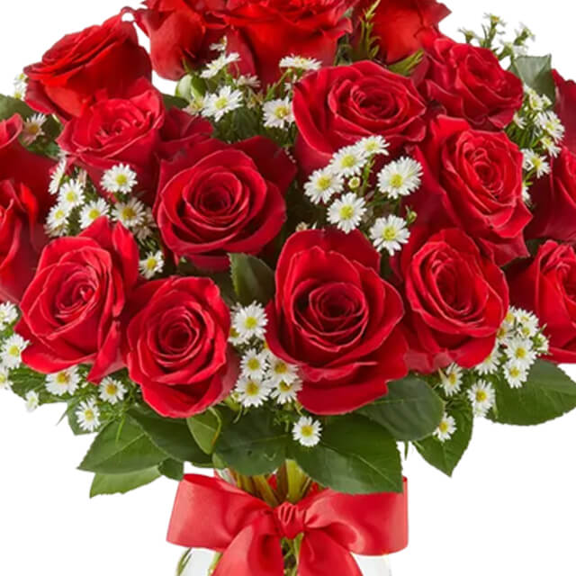 Eighteen luxe red roses blaze with unspoken devotion, their velvet petals framed by airy Monte Casino blooms in a crystal-clear vase crowned with a plush red bow—the ultimate symbol of timeless romance, perfect for anniversaries, proposals, or moments demanding extraordinary affection.