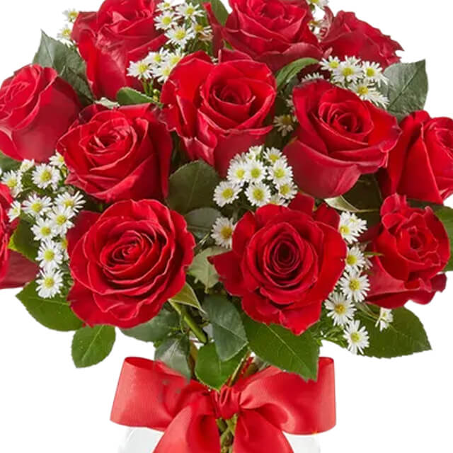 Let twelve lush red roses, accented with delicate monte casino blooms, speak the language of love in its purest form. Presented in a crystal-clear vase adorned with a rich red bow, this timeless arrangement transforms heartfelt emotions into an unforgettable gift—perfect for anniversaries, Valentine’s Day, or moments when only the grandest gesture will do.
