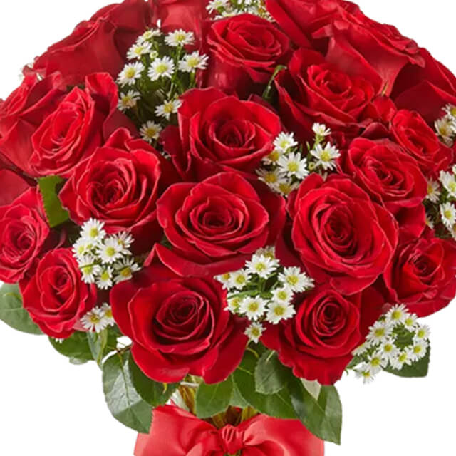 Twenty-four sumptuous red roses command attention in this lavish display of passion, their velvety depths accented by wispy Monte Casino sprigs in a timeless glass vase wrapped with a bold red bow—an unmistakable statement for anniversaries, grand gestures, or when only the most profound love deserves expression.