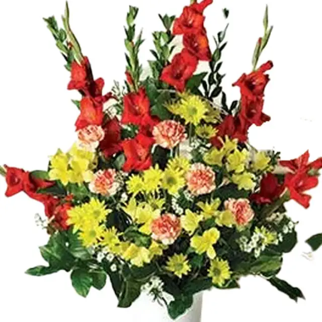 A vibrant sympathy arrangement overflowing with red gladiolus, bi-color carnations, yellow alstroemeria and more. Hand arranged by a florist, it is available for delivery to a funeral home to be displayed on a stand. Floral arrangement measures approximately 35""H x 34""W x 19""D. Includes: • Red Gladiolus • Orange Carnations • Yellow Alstroemeria • White Floral Container