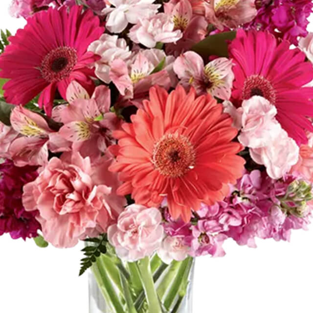 Vibrant coral and hot pink gerbera daisies take center stage, dancing with charming pink alstroemeria and fluffy carnations in a sleek glass vase. This electrifying mix of sunset hues and lush greenery is like bottled sunshine—perfect for celebrating birthdays, lifting spirits, or sending love that shines as bright as your feelings.