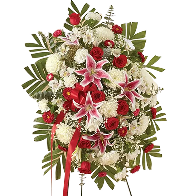 An all red floral sympathy standing spray arranged with a wonderful mix of flowers. Appropriate to send directly to a funeral home for a friend, co-worker or family member during this difficult time. This standing spray is created with red roses, red daisies, white football mums, and vibrant pink stargazer lilies. Measures approximately 46""H x 38""L.
