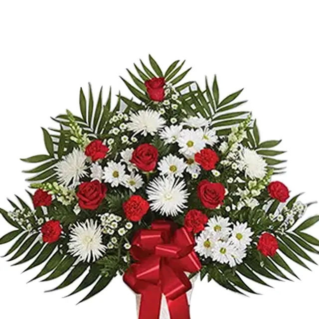 The red and white sympathy floor basket with fresh blooms including red and white flowers. Classic red roses and carnations along with white gladioli and spider mums are a wonderful sympathy gift for the funeral of a dear friend or loved one. Arrangement measures approximately 30""H x 36""L.