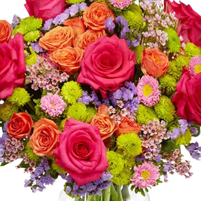 These stunning blooms are reminiscent of a sweet strawberry sundae! Your sweetheart is sure to love that you thought of her, whether it's her birthday, anniversary, or you just want to remind her how loved she is. Bright pink roses and orange tea roses are surrounded pops of neon green and pastel pink poms creating a stunning masterpiece!
