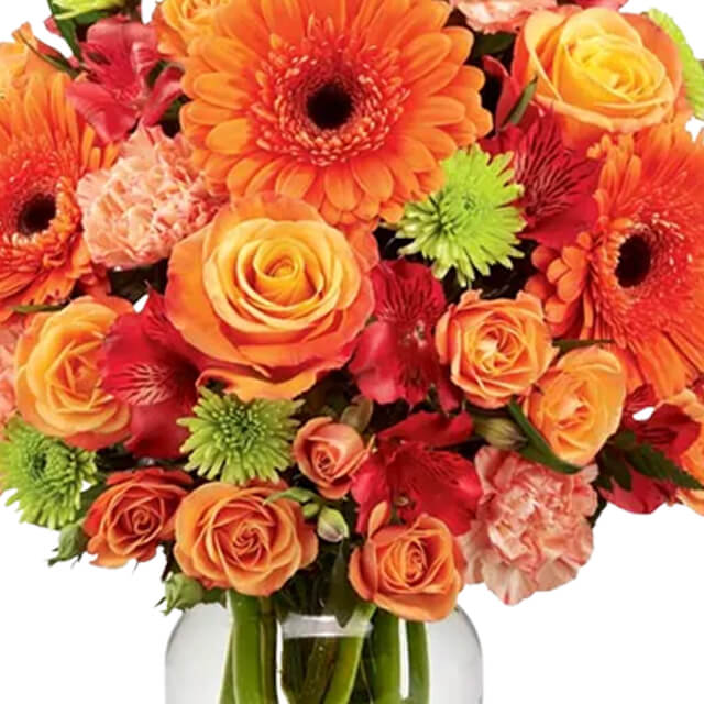Bold orange roses, cheerful gerbera daisies, and playful alstroemeria dance together in this energetic arrangement, accented by fresh greenery and presented in a crisp glass vase – a radiant way to send birthday cheers, heartfelt thanks, or sunny just-because surprises.